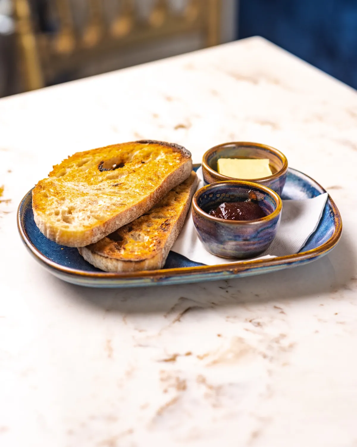 Sometimes, simplicity is the ultimate sophistication. Our Sourdough Toast is a testament to this. Thick slices of bread slathered with tangy marmalade and salted butter provide a classic and delicious start to your day.