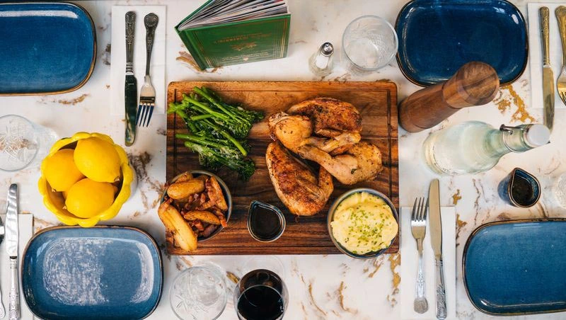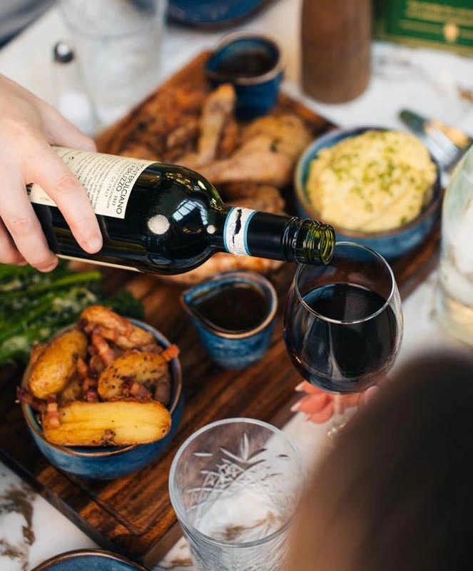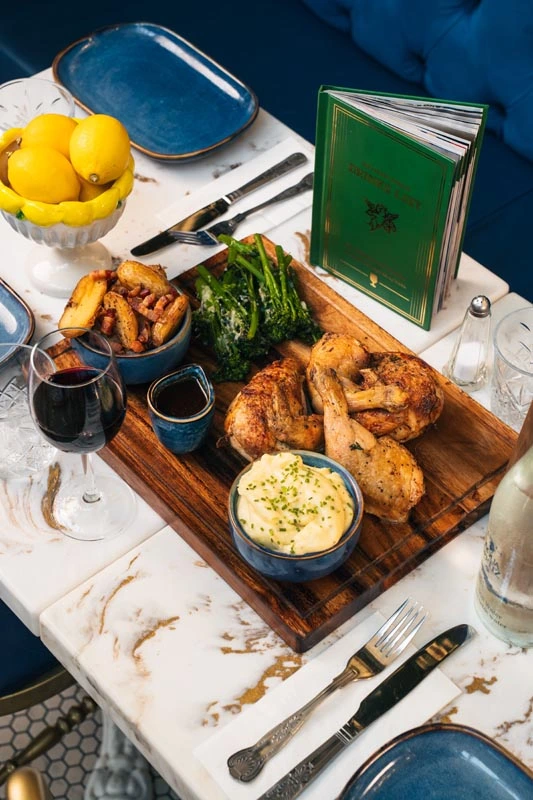 Serves two or two adults and two small children Oven roast chicken – roast baby potato with pancetta, creamy mash and seasonal vegetable served with Italian red wine gravy (Available on a Sunday)