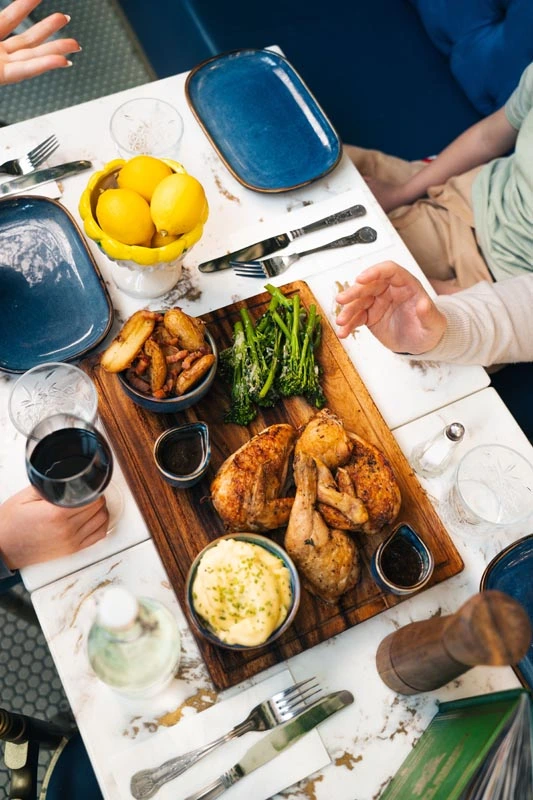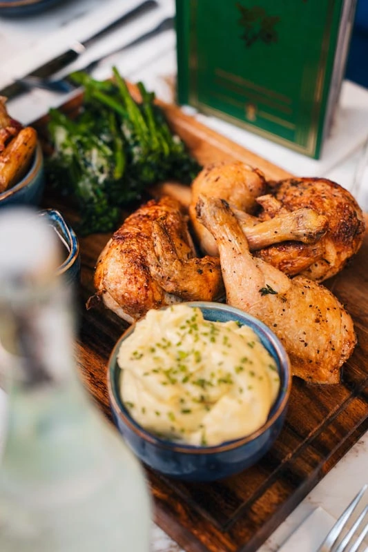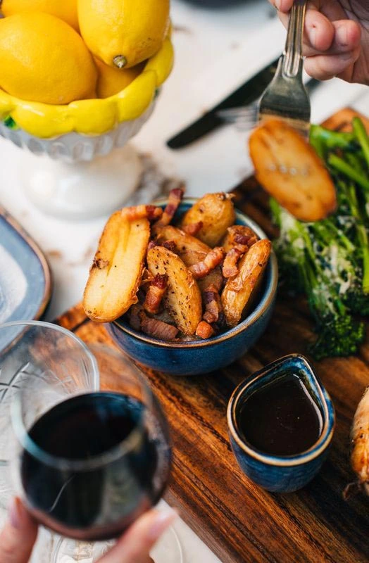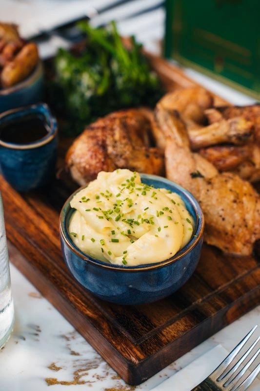 Serves two or two adults and two small children Oven roast chicken – roast baby potato with pancetta, creamy mash and vegetable served with Italian red wine gravy